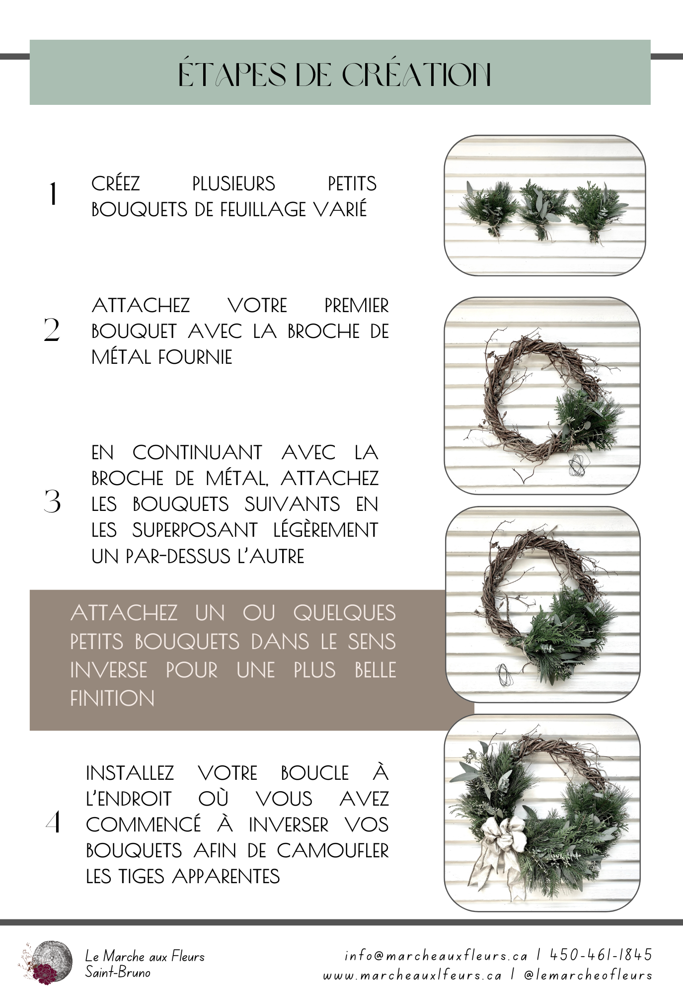 - Installez votre boucle à l’endroit où vous avez commencé à inverser vos bouquets afin de camoufler les tiges apparentes
