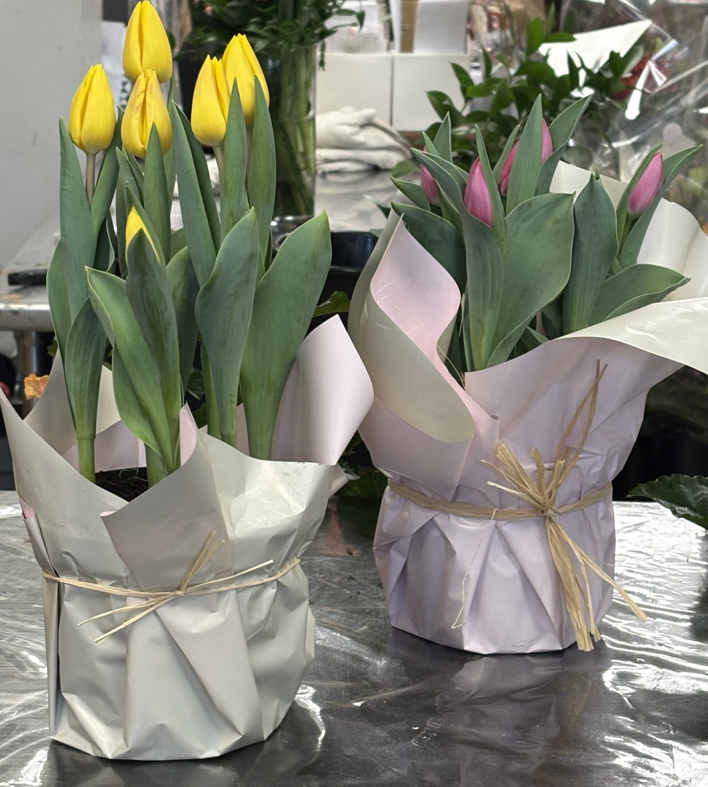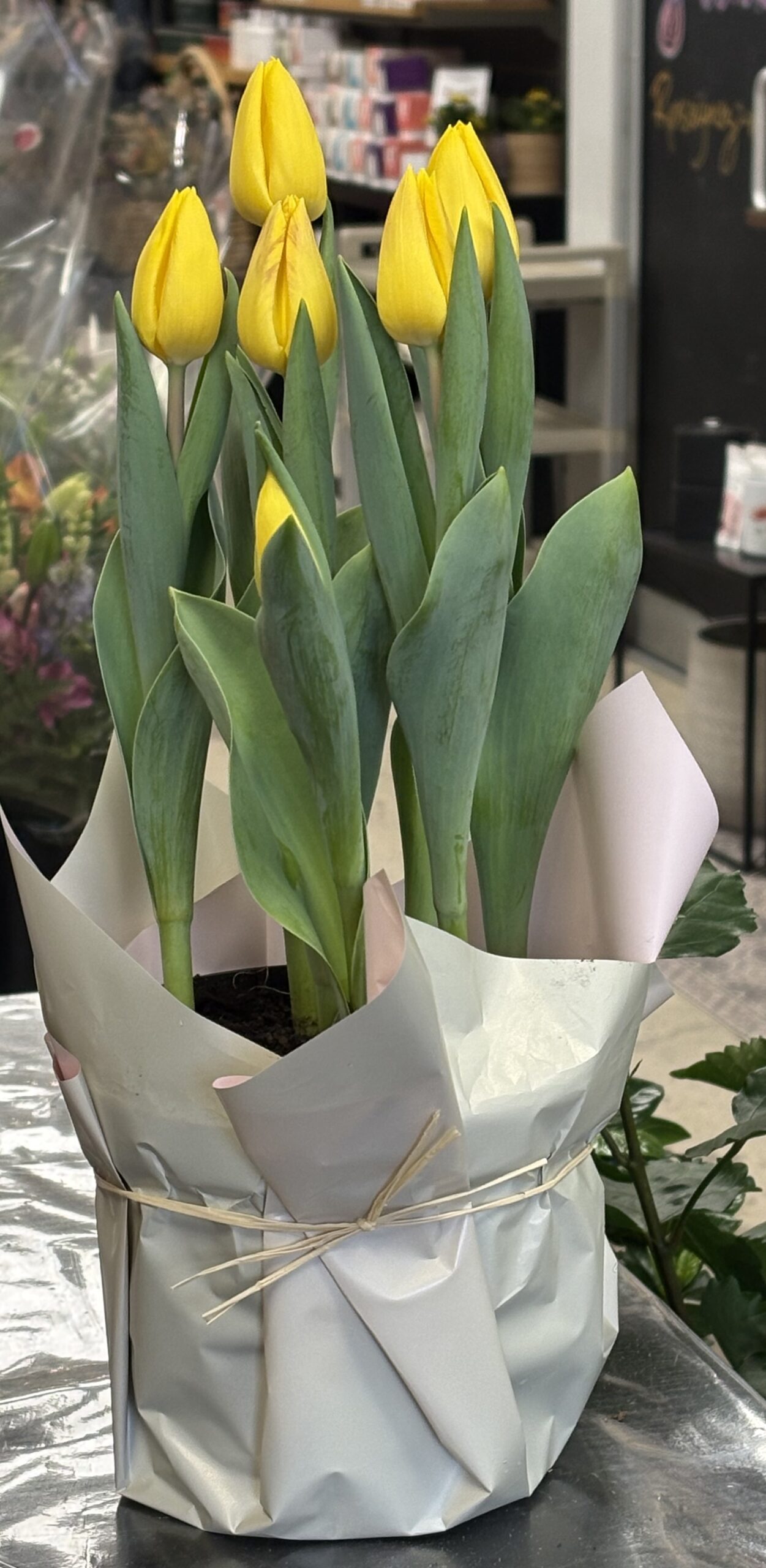 Bulbes de tulipes dans pot de 6po ou 8po avec emballage décoratif.
